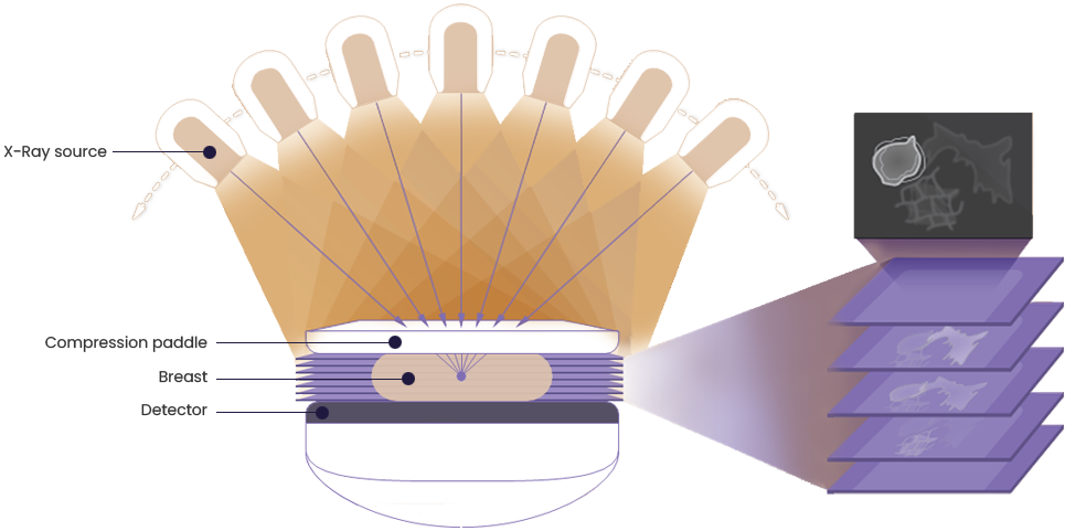 The X-ray tube moves on the breast and takes high-definition, high-resolution images with high contrast from various angles.